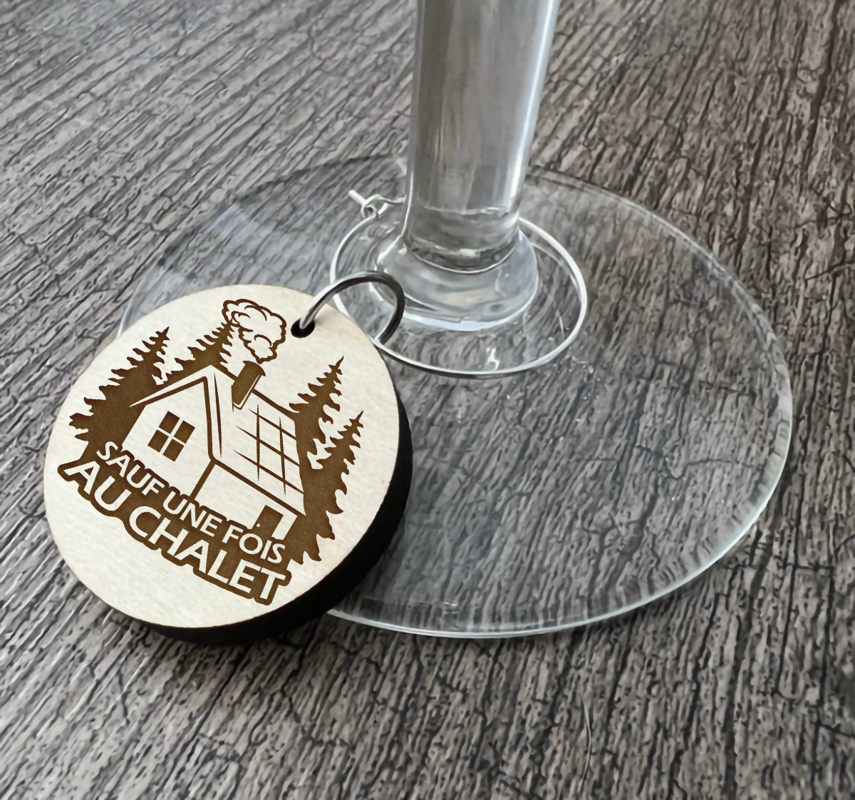 Un identificateur à coupe de vin "Sauf une fois au chalet"